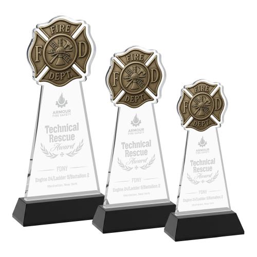 Celebrate the bravery and dedication of fire department personnel with the Fire Dept on Hartford Base Black Unique Crystal Trophy. Expertly crafted from radiant Starfire Crystal, this award offers unparalleled clarity and sophistication. Its distinctive design features a detailed fire department emblem at the top, set on a sleek, side-tapered Hartford base that adds both depth and elegance. Ideal for recognizing service milestones, acts of bravery, or departmental excellence, this trophy serves as a lasting tribute to those who protect and serve. Optional second position etch and colorfill customization make it even more special and personal.
