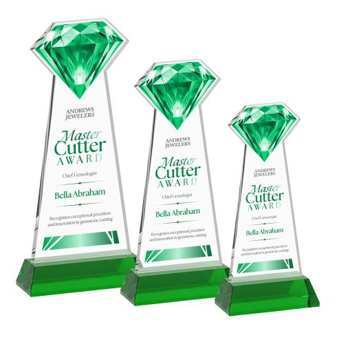 Celebrate unparalleled success with our Diamond Full Color on Hartford Base Green Crystal Trophy. This exquisite award is expertly crafted from premium Starfire crystal and features a striking, gemstone-shaped cutout that radiates elegance. The captivating design is highlighted by a vibrant, full-color VividPrint gemstone image, adding a personalized touch to suit your unique style or event theme. Its sleek, side-tapered base provides a sophisticated and contemporary presentation, making it a standout piece for any achievement. With nine gemstone colors available, this trophy is ideal for recognizing exceptional accomplishments with flair and distinction.