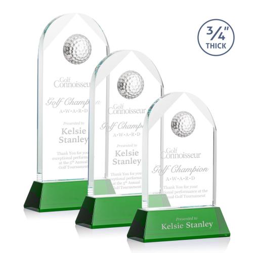 Elevate the celebration of golfing excellence with the Starfire Crystal Blake Golf Award. This distinguished trophy boasts a graceful beveled arch design, crowned with an intricately detailed Optical Crystal Golf Ball that capture the spirit of the sport. It proudly stands on a robust, tapered Optical Crystal base, available in a striking green that adds a lush touch reminiscent of the fairway. Crafted from premium crystal with a globe and peaks shape, this award stands 3/4" thick, promising to be a substantial and elegant memento. Whether celebrating a tournament victory, hole-in-one, or commemorating a cherished member of the golf community, this award offers a gleaming tribute to those memorable moments on the green. Customizable with a 2nd position etch for an added personalized touch, this trophy symbolizes achievement with timeless sophistication.