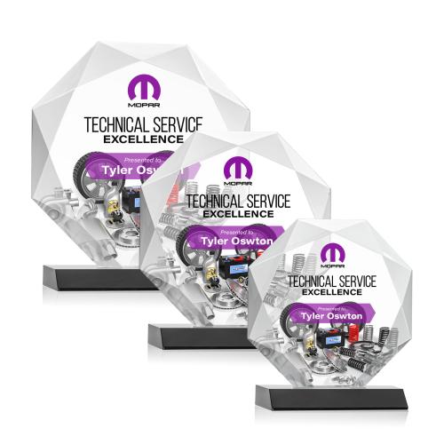 Honor achievements with the sophisticated allure of the Minor Full Color Black Polygon Crystal Trophy. This exquisite piece, crafted from luminous Starfire Crystal, showcases a unique octagonal polygon shape that captures and refracts light, casting a radiant display sure to mesmerize and acclaim any recipient. Whether for corporate recognition or personal milestones, this trophy is available in three distinct sizes, accommodating a range of occasions. The crisp, clear crystal provides an ideal canvas for your personalized message, which comes to life with our vibrant VividPrint technology. Choose from nine elegant colored bases to further customize and reflect your brand or event theme. The option for a second position etch and color fill gives even more opportunity to tailor this award to your specific honors. Celebrate excellence with this modern, eye-catching symbol of success.