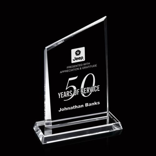 Elevate the recognition of excellence with the Starfire Peaks Crystal Trophy, a striking symbol of achievement and appreciation. Crafted from pristine starfire crystal, this luxurious award stands 8 inches tall, with options to upscale to 9" or 10" for a grander statement. The distinctive design features asymmetrical flaring bevels that create a dynamic play of light, framing the substantial central etching area awaiting personalization. Whether honoring 50 years of service or a milestone accomplishment, this crystal trophy's elegant peaks and reflective nature are sure to impress and serve as a treasured keepsake. Let the Starfire Peaks Crystal Trophy speak volumes about the value you place on outstanding contributions and distinguished milestones.