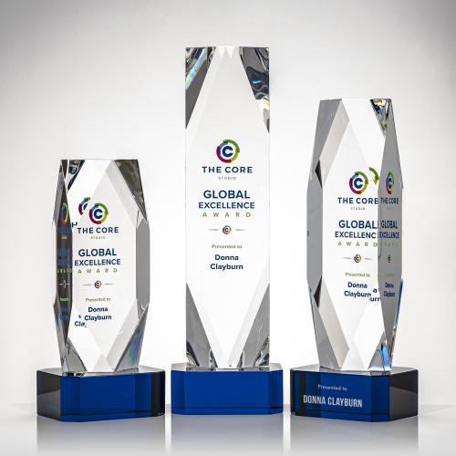 Celebrate outstanding achievements with the Atkinson Full Color on Base Blue Towers Crystal Trophy, an embodiment of elegance and distinction. Crafted from the finest crystal, this trophy features a sleek tower design that rises dramatically to a point, drawing the eye upward and symbolizing the pinnacle of success. The deep faceted corners carve a diamond-shaped window, amplifying the brilliance of refracted light and providing an exquisite backdrop for personalized messages of excellence. Proudly seated upon a robust, blue crystal base, this award is not just a token of recognition but a piece of art that will command attention in any display. Perfect for high-profile awards, corporate commemorations, or as a symbol of gratitude that will leave a lasting impression, this trophy is a tangible celebration of exceptional achievement.