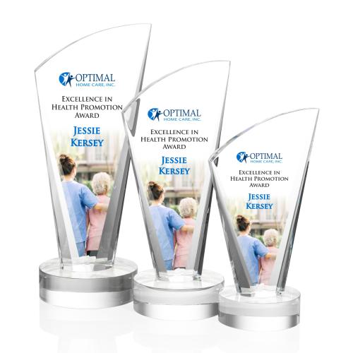 Illuminate the pinnacle of success with our Bunch Full Color Clear Peaks Crystal Trophy, an exquisite symbol of achievement and recognition. Crafted from the finest crystal, this award boasts a dynamic arrangement of multi-beveled edges that ascend to an elegantly arched summit, creating a cascade of reflections mirroring the luminescence of Hollywood's glamour. Perfectly complemented by a sturdy, round optical base, this trophy is poised to highlight any personal or professional milestone. With its capability for full-color VividPrint, your personalized message or logo will not just be seen but truly shine, ensuring that each recipient feels uniquely celebrated for their outstanding accomplishments. Whether for honoring excellence in business, sports, or community service, the Bunch Clear Peaks Crystal Trophy stands as a timeless testament to exceptional performance.