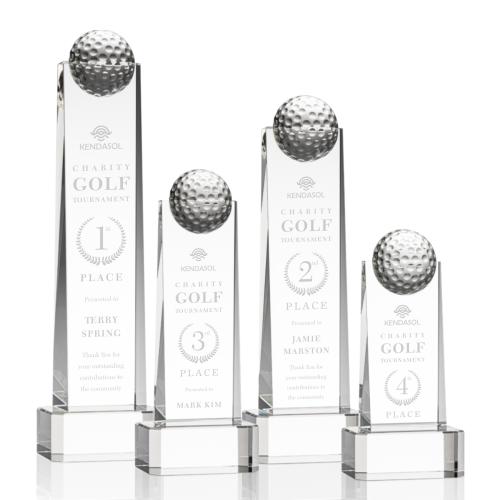 Celebrate the triumphs on the fairway with the exquisite Marks Golf on Base Clear Towers Crystal Trophy. Expertly crafted from premium crystal, this trophy boasts a tower design that ascends to a meticulously detailed, domed golf ball, symbolizing the pinnacle of golfing achievements. The trophy sits atop a gleaming clear base, providing an ideal canvas for personalized engravings to commemorate tournament victories, personal milestones, or exceptional performances. Its towering presence and radiant finish make this award a prestigious addition to any golfer's collection, embodying both the spirit of the sport and the grandeur of victory.