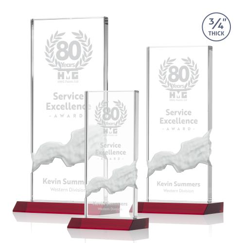 Celebrate milestones and commend achievements with the Rubin Red Rectangle Crystal Trophy. Crafted from premium Starfire Crystal, each trophy boasts a substantial .75" thickness, exuding high-quality and permanence. The rectangular award is accentuated by a deeply carved waterfall effect, a sophisticated design element that infuses each piece with dynamic movement and a contemporary flair. Poised atop a polished Ruby Red mitered base, this trophy offers a striking contrast and a splash of color, ensuring it stands out in any display. Whether for corporate recognition, team accolades, or personal milestones, the option for a 2nd position etch allows for customizable messages that make each award truly unique. Honor excellence and create lasting impressions with this distinctive and elegant crystal trophy.