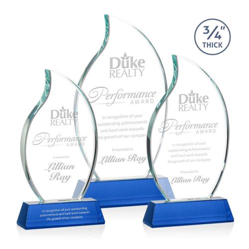 Ignite the recognition your recipients deserve with the Summers Flame on Helton - Blue award, an exquisite symbol of achievement and excellence. This radiant accolade is masterfully crafted from premium 3/4" thick Starfire Crystal, delicately shaped into an evocative flame that surges upward, symbolizing the passion and vibrant spirit of success. The award stands poised on one of eight dazzling Newhaven bases, coated in a serene blue hue that enriches its crystal clarity. While each piece begins as a blank canvas awaiting your personalized touch, optional second position etchings offer additional space to honor milestones or inscribe words of praise. With its sleek and fluid design, the Summers Flame on Helton - Blue is a tangible testament to the burning dedication and luminous achievements of its recipients.