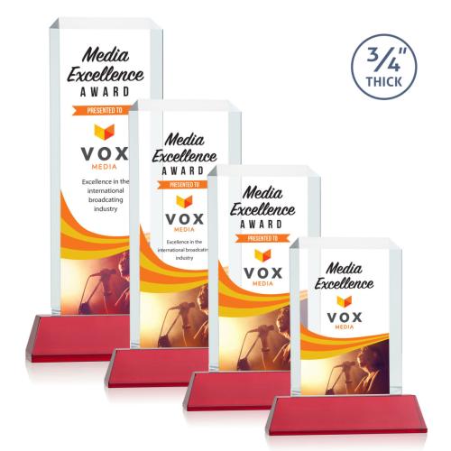 The Carey on Helton Full Color Red Rectangle Crystal Trophy is a testament to achievement and recognition, offering a sleek and modern design to honor excellence. Cut from premium crystal and boasting a substantial 3/4" thickness, this radiant trophy features mitered edges that catch and reflect light beautifully, enhancing the personalized message you choose to engrave. It stands proudly on an eye-catching, vibrant red Newhaven base-available in a selection of eight colors-to match your organization's style or the recipient's achievement. This award's rectangular silhouette and optional second position etch & colorfill provide ample space for customization, making it not just a trophy, but a memorable keepsake. Whether for corporate recognition, academic honors, or other special accomplishments, this stunning award will capture the moment with elegance and poise.