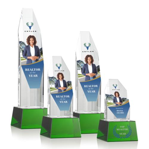 Elevate the recognition of excellence with the Cunningham Full Color on Base Green Polygon Crystal Trophy. This trophy blends the clarity of optical crystal with the vibrant touch of a green polygon base, making it an elegant yet bold statement of achievement. The sophisticated facets of the multi-dimensional obelisk serve as a perfect canvas for bespoke personalization, offering a diamond-shaped imprint area to honor the recipient's outstanding performance. Ideal for a range of accolades from 'Realtor of the Year' to top sales awards, this trophy not only commemorates success but also stands as a remarkable piece of art. The optional second position imprint provides an additional custom touch to this already unique award, ensuring that each recipient feels truly esteemed.