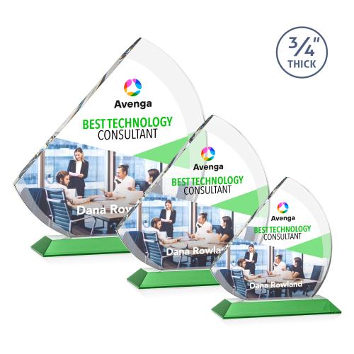 Celebrate exceptional achievements with the Yanez Full Color Green Peaks Crystal Trophy, a symbol of success that combines modern design with timeless elegance. Crafted from premium 3/4" thick Starfire Crystal, this stunning award features unique peak shapes and deep bevels that converge to a flat edge, creating a dynamic display of light and color. The trophy rests on a vibrant emerald crystal base, providing a striking contrast and a steady foundation. Perfect for personalization, this exquisite piece stands ready to be customized with vibrant full-color images, logos, and text, ensuring that each recipient's honor is as unique as their contribution. Ideal for recognizing top performers, milestone achievements, or significant contributions, the Yanez Crystal Trophy is not just an award-it's a cherished keepsake that embodies excellence.