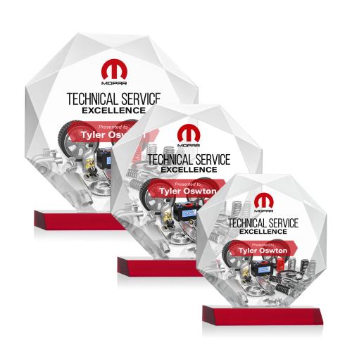 Celebrate excellence and achievements with the Minor Full Color Red Polygon Crystal Trophy, a prestigious award that embodies brilliance and appreciation. Crafted from premium Starfire crystal, its octagonal shape is designed to refract light, magnifying its splendor from every angle. This trophy comes in three different sizes, each resting on a vibrant red base that adds a pop of color, enhancing its visual impact. The award offers full-color VividPrint capabilities, ensuring your personalized message is not only seen but felt. Optional second position etch and color fill provide additional customization to make this award truly unique for any recipient. Perfect for honoring milestones and exceptional service, this crystal trophy transforms any acknowledgement into a memorable event.