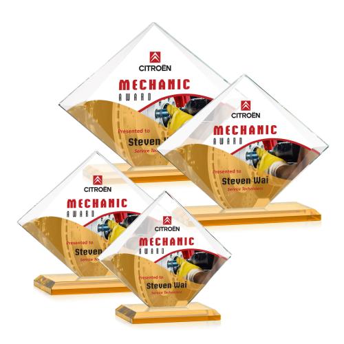 Showcase the pinnacle of achievement with the Latham Full Color Amber Diamond Crystal Trophy. Crafted from pristine Starfire Crystal, this exquisite award boasts beveled edges that gracefully taper, creating a diamond silhouette that sparkles with elegance. The amber-colored base adds a warm, illuminating touch, enhancing the full-color VividPrint customization that makes your message resonate with vibrancy. Each trophy comes nestled in a black satin-lined presentation box, perfect for gifting. With eight color choices for the base, personalize this trophy to perfection and celebrate exceptional success with a touch of sophistication.