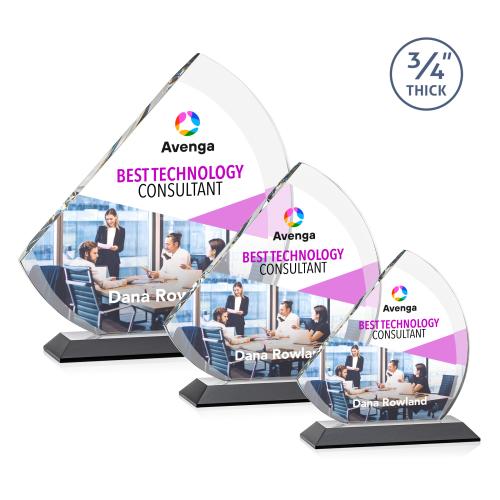 Honor exceptional achievements with the Yanez Full Color Black Peaks Crystal Trophy, a symbol of pinnacle success. Crafted from premium 3/4-inch-thick Starfire Crystal, this award boasts an impressive design featuring contrasting deep bevels that ascend to a sleek flat edge, culminating in a bold peak motif. The trophy rests on a robust ebony crystal base, creating an elegant yet commanding presence. With its unique shape and full-color customization capability, this trophy is perfect for showcasing high-resolution images, logos, or personalized messages to celebrate top performers in any industry. Elevate your recognition program with this stunning piece of artistry, designed to leave a lasting impression.