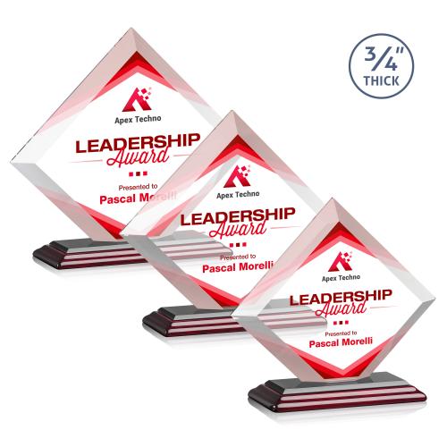 Celebrate excellence and honor milestones with the Carlson Full Color Wood Diamond Crystal Trophy â a pinnacle of achievement for any recipient. Crafted with precision, this prestigious award features a stunning diamond-shaped crystal poised elegantly atop a sophisticated triple-stepped rosewood Albion base, offering both durability and a classic aesthetic. Each trophy boasts a generous thickness of 3/4", ensuring a remarkable presence and weight. With the option of full-color VividPrint, your personalized message of commendation is not just inscribed but brought to life against the crystal backdrop, ensuring every pass of light accentuates the depth and clarity of your heartfelt words. Perfect for corporate recognition, educational accomplishments, or any celebratory event, this trophy will serve as a timeless emblem of success and a cherished keepsake for years to come.