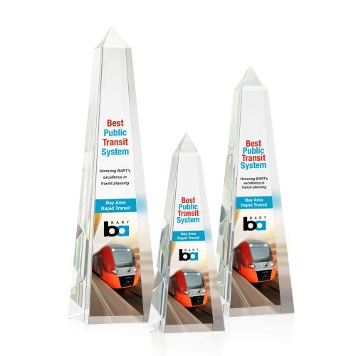 Elevate your recognition program with the Slaughter Full Color Obelisk Crystal Trophy, an embodiment of excellence and prestige. This visually striking, freestanding obelisk is masterfully crafted from pure optical crystal, ensuring unparalleled clarity and a high-quality feel. Make a lasting impression with its captivating facet peak design, perfect for showcasing vivid, full-color personalization or corporate branding. Whether it's to honor a corporate milestone, a personal achievement, or to award winners at a competitive event, this statuesque award radiates success and is sure to take pride of place in any display. Each Slaughter Crystal Trophy arrives ready for custom engraving, making every piece as unique as the accomplishment it celebrates.