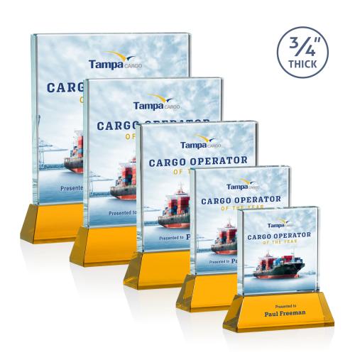 Celebrate outstanding achievements with the Landers Full Color on Helton Amber Square Crystal Trophy, a symbol of excellence and recognition. Crafted from premium 0.75-inch-thick Starfire Crystal, this exquisite square/cube-shaped award rests on a sleek, tapered base available in a selection of eight vibrant colors to complement any corporate identity or event theme. The ample space on the clear pane offers a full-color canvas for personalized messages, logos, or images, making it an ideal choice for corporate honors, team accomplishments, or individual recognition. With its bold design and elegant stature, this trophy is poised to make a statement in any showcase or desk, commemorating success with a memorable and lasting impression.