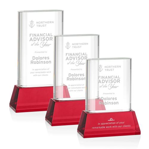 Celebrate excellence with the Downey on Base Red Rectangle Crystal Trophy, a prestigious award that adds radiant sophistication to any recognition event. Crafted from premium optical crystal, this trophy boasts a classic rectangular shape that naturally draws the eye upward, highlighting the accomplishments of its recipient. The trophy sits atop an elegant tapered crimson red base that not only provides a vivid contrast but also underscores its distinguished character. Its stepped and curved sides create prismatic reflections, amplifying the splendor of your personalized message which can be expertly etched onto the crystal. With options for a second position etch and color fill, this trophy can be custom-tailored to fit any accolade or expression of gratitude, ensuring it is as unique as the achievement it celebrates. Whether for corporate recognition, academic honors, or personal milestones, this trophy resonates with the gravity and joy of exceptional success.