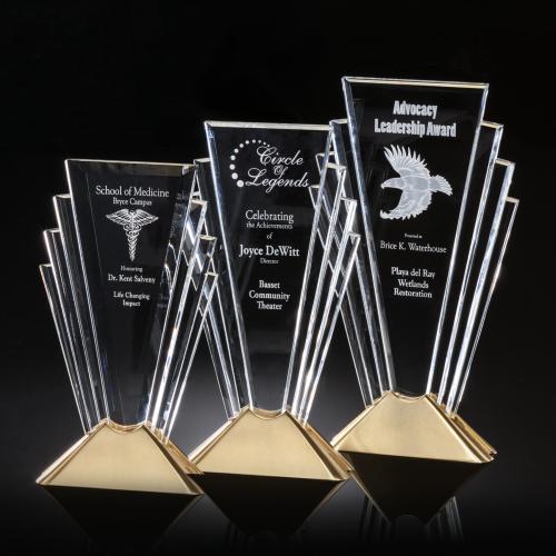 Elevate your accolades with the Lopes Gold Towers Crystal Trophy, a stunning symbol of achievement and recognition. Expertly crafted from optical crystal, this award showcases seven spectacularly beveled spears that form an elegant tower of clarity and refraction. Each spear unites at beautifully dramatic angles, creating a radiant crystalline beam that symbolizes excellence. Anchoring this achievement in artistry is a robust metal base available in a choice of a brushed gold or silver-plated finish, imbuing the trophy with a sense of prestige and solidity. Designed to inspire awe and honor the extraordinary, this trophy is the perfect tribute to celebrate excellence in all its facets. Whether for corporate recognition, academic accomplishments, or distinguished service, the Lopes Gold Towers Crystal Trophy stands as a testament to high achievement.