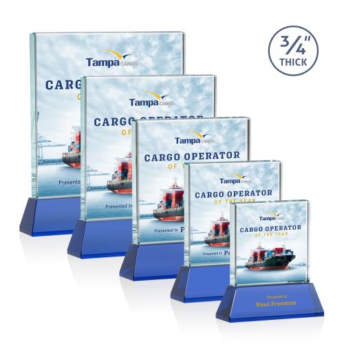 Celebrate milestones and commend achievements with the exquisite Landers Full Color on Helton Blue Square / Cube Crystal Trophy from Trophy.com. Crafted from lustrous 0.75-inch thick Starfire Crystal, this award stands out with its modern square or cube shape, cleanly mounted atop a sleek, tapered Starfire base available in 8 vibrant colors to match your corporate palette or event theme. Its substantial build and timeless design make it an impressive display of recognition for any recipient. Ideal for corporate honors, this crystal trophy not only signifies success but also functions as a sophisticated memento that recipients will treasure for years to come. With the option for full-color personalization, each Landers Crystal Trophy can be tailored to celebrate the unique contributions and accomplishments of the awardees.