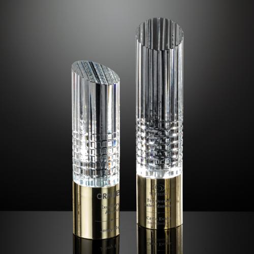 Elevate moments of achievement with the refined elegance of the Fonseca Huang Gold Towers Crystal Trophy. Artistry meets prestige in these statuesque awards, expertly crafted from pure optical crystal. Each tower's design is carefully sculpted with intricate ripples that traverse its body, catching and refracting light, to mesmerize and captivate onlookers. The trophy stands regally upon a resplendent gold base, which adds a touch of opulence and provides a perfect canvas for personalized engravings. These trophies, sophisticated and timeless, are the pinnacle of recognition, ideal for honoring excellence in every field. Whether to celebrate corporate milestones, individual success, or significant accomplishments, they leave a lasting impression of respect and admiration.
