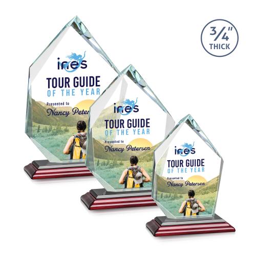 Celebrate exceptional achievements with the Boone Full Color Wood Peaks Crystal Trophy, a striking tribute to success and excellence. This sophisticated award, sculpted from premium 3/4" thick Starfire Crystal, showcases deep, interlocking bevels that create an enchanting play of light, bringing your personalized message to life. Set upon a choice of nine vibrant colored bases, this trophy not only stands out in any setting but also allows you to reflect a sense of style and organization branding. Whether honoring a top performer, a milestone, or a unique accomplishment, the Boone Full Color Wood Peaks Crystal Trophy is designed to create a lasting impression and radiant display of recognition.