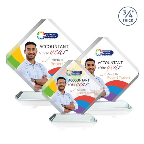 Celebrate achievements with the exquisite Jacobsen Full Color Starfire Diamond Crystal Trophy, a symbol of excellence and prestige. Crafted from premium quality crystal, this diamond-shaped award radiates brilliance with its beveled edges and sleek, modern design. Perfect for acknowledging outstanding performers or marking significant milestones, each trophy offers the option of a clear or tastefully colored mitered base, enhancing its visual impact. While presented with exemplary personalization in the example, rest assured that each trophy arrives blank, offering a canvas for your own customized recognition message. Elevate any ceremony with this magnificent award, destined to become a cherished keepsake for its recipient.