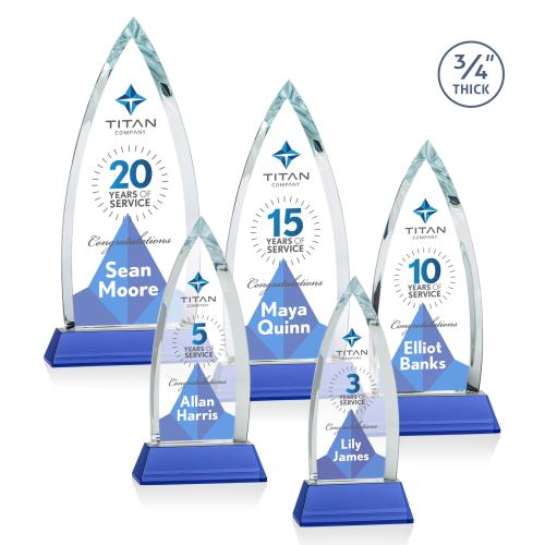 Celebrate extraordinary achievements with the Valdes Full Color on Helton Blue Peaks Crystal Trophy, a symbol of excellence that merges elegance and modern design. This exquisite 3/4" thick Starfire crystal piece captivates with its arrowhead shape and stunning deep bevels, designed to shine a spotlight on success. Mounted sturdily on a rich sapphire crystal base, the trophy offers ample space for personalization through full-color VividPrint. Its crystal clarity and sleek peaks serve as a metaphor for high aspirations and triumphant accomplishments. The Valdes Trophy is an ideal selection for recognizing milestones, honoring years of service, or celebrating significant accomplishments. Add an optional second etch position to further customize this distinguished award, starting with a blank canvas to impeccably reflect your message of admiration and recognition.