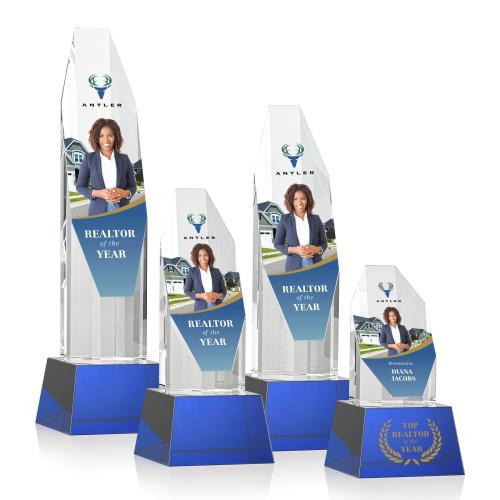 Honor excellence and celebrate milestones with the Cunningham Full Color on Base Blue Polygon Crystal Trophy. Meticulously crafted from the finest crystal, this award features an elegant polygonal design that culminates in a distinctive diamond-shaped surface, perfect for showcasing vivid, full-color images or inscriptions of remarkable achievements. The trophy stands proudly on a tapered, sapphire blue optical crystal base that adds a touch of sophistication and provides ample space for personalized messages. Whether for recognizing 'Realtor of the Year,' a corporate recognition, or any significant accomplishment, this trophy is a tangible symbol of success and distinction. Each trophy begins as a blank canvas, awaiting your custom touch to make it a truly unique and memorable award.