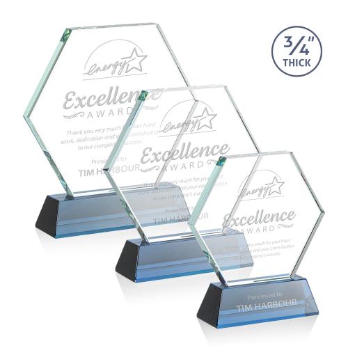 Honor excellence with the Helton Sky Blue Polygon Crystal Trophy, a striking symbol of achievement and recognition. This premium award stands out with its unique hexagonal design, crafted from 0.75" thick starfire crystal, ensuring a lustrous and clear display. The trophy is elegantly perched atop a tapered optical base, available in clear or a serene sky blue option, enhancing its contemporary appeal. Perfect for personalized etching, this elegant crystal trophy is designed to celebrate accomplishments in a memorable way, making it an ideal choice for corporate awards, academic honors, or any special milestone. Start with a blank canvas and customize this beautiful award to create a lasting impression that honorees will cherish for years to come.