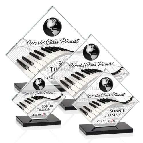 Celebrate worldly achievements with our Buckley Full Color Black/Silver Globe Crystal Trophy. This exquisite piece features a stunning Starfire Crystal Diamond, thoughtfully accented with a solid, black optical globe with finely etched continents highlighted in shimmering silver. Resting on a sleek ebony base, this award seamlessly embodies the spirit of international excellence and success. Ideal for recognizing outstanding global initiatives or celebrating a reach that spans continents, this crystal trophy is sure to make a bold statement in any setting. Note: The trophy comes blank, ready to be personalized with your choice of text and design to honor your distinguished recipients.