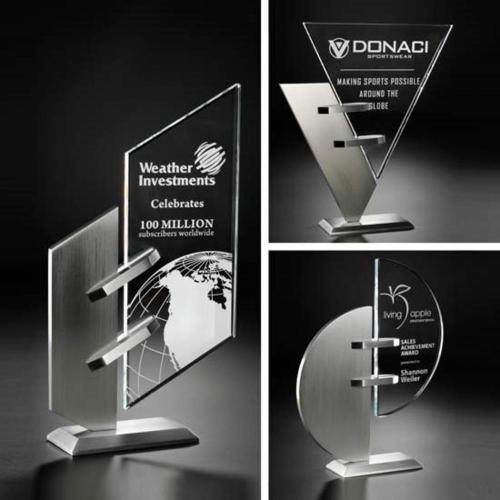 Celebrate excellence and achievement with the Wilhlm Triangle Unique Crystal Trophy, a symbol of modern elegance and sophisticated design. This stunning piece masterfully combines the sleek clarity of Starfire glass with a satin finish, hand-brushed aluminum base, showcasing an avant-garde triangular silhouette. The architectural harmony of materials is accentuated by the daring cantilevered fasteners that give the illusion of the crystal pane floating gracefully in space. Perfect for commemorating corporate milestones, personal achievements, or any prestigious event, this trophy can be customized to embody the spirit of the accomplishment it represents, ensuring it stands as a dignified and cherished keepsake for years to come.