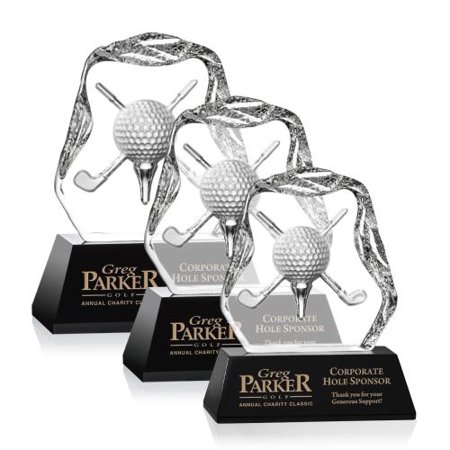 Celebrate every golfing triumph with the sophisticated elegance of the Hilliard Golf Black Crystal Trophy. Expertly crafted, this unique award features an intricately detailed golf ball and intersecting clubs, masterfully carved within a stunning iceberg-shaped crystal. Resting on a sleek black optical crystal base that offers ample space for personalization, this trophy comes with the option of one color fill, allowing you to add a touch of personal flair. Ideal for commemorating hole-in-one achievements, tournament wins, or as a distinguished memento for golf enthusiasts, this trophy epitomizes the spirit of the game with its blend of luxury and timeless charm. Each piece is made from the highest quality crystal, ensuring that this award will remain a treasured keepsake for years to come.