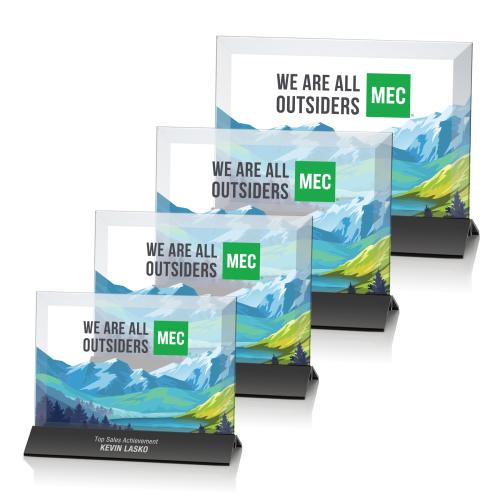 Celebrate achievements and milestones with the sophisticated Boswell Full Color Black/Horizontal Rectangle Crystal Trophy. Crafted from premium Starfire crystal, this award features a sleek rectangle design with beveled edges that capture and reflect light, adding a touch of elegance to any setting. The trophy's crystal clarity is perfectly complemented by a matte-finished black metal base, offering a modern and sturdy foundation. Your personalized message or logo is brought to life through a vibrant full color VividPrint imprint on the back of the crystal, producing a stunning visual effect that appears to float within the crystal. Ideal for corporate awards, team recognition, or personal accolades, this trophy is a truly exceptional choice for anyone looking to make a lasting impression. (Note: This product starts as a blank canvas, ready for your custom design.)