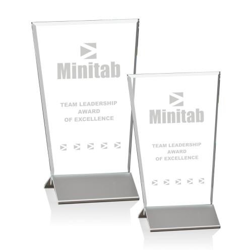 Introducing the Odell Aluminum Towers Crystal Trophy â an exquisite blend of elegance and modern design, ideal for recognizing outstanding achievements. Crafted from premium starfire glass, this trophy features a .25" thick, narrow-beveled upright with a flared, straight top, offering a large etching area for personalization. The pleated aluminum base not only provides sturdy support but also adds a stylish contrast to the lucid crystal. Available in 6" and optional 8" heights to suit your needs, the Odell Trophy presents a significant statement of recognition. Each trophy starts as a blank canvas awaiting your custom inscription, making it a unique and distinguished award for excellence in any field.