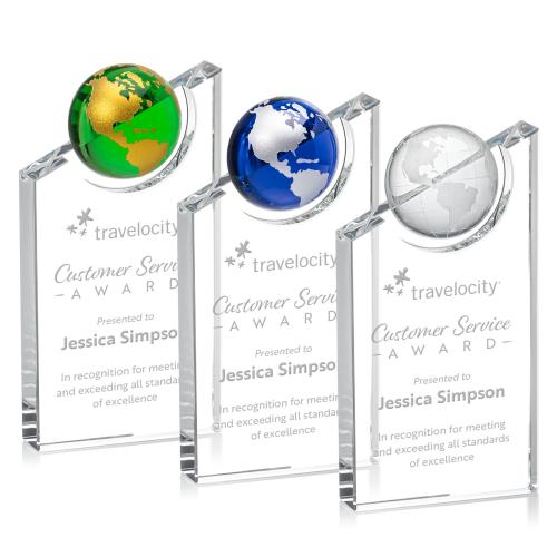 Celebrate outstanding achievements with the Simpson Globe Crystal Trophy, a captivating symbol of global excellence and ambition. Each trophy is expertly crafted from the finest crystal, featuring a unique freestanding rectangle silhouette, distinguished by a polished semicircular opening that cradles a beautifully detailed half-globe. The globe, available in clear with frosted continents or a choice of blue, black, or green with gold or silver color-filled continents, appears suspended within this space, creating a mesmerizing display of craftsmanship. The generous etching area gives ample space for personalized messages, acknowledging the recipient's international perspective or commitment to a global vision. With its harmonious blend of elegance and meaning, this trophy makes the perfect addition to any accolade or recognition program, ready to be admired for years to come.