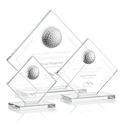 Celebrate every triumphant moment on the green with the Humphrey Golf Clear Globe Crystal Trophy. Masterfully crafted from the finest crystal, this elegant award showcases a stunning 3D golf ball poised atop a sleek diamond-shaped Starfire Crystal, both melding seamlessly into a robust Starfire Crystal base. Its contemporary design reflects a sophisticated blend of artistry and sporting spirit, available in three distinct sizes to suit any level of achievement. Perfect for personalization, this trophy is a blank canvas ready to be adorned with the details of your prestigious golf event, ensuring each recipient feels proud to display their accolade. Elevate your awards ceremony with this sophisticated memento of success, a timeless piece that honorees will treasure for years to come.