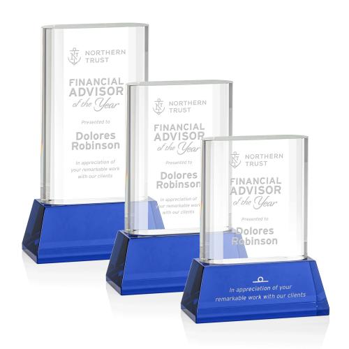 Celebrate achievements with the Downey on Base Blue Rectangle Crystal Trophy, a prestigious symbol of recognition and appreciation. Crafted from pristine optical crystal, this elegant award illuminates any accomplishment with its stepped and curved side facets that catch and reflect the light in a dazzling display. The sleek rectangular shape provides ample space for personalization, making it perfect for commemorating personal milestones, business successes, or team accolades. It rests on a striking optical sapphire blue base, adding a pop of color and grandeur to the overall design, capturing the eye and raising the prestige of the award. Optional second position etch & colorfill can further tailor this piece to the occasion or the recipient, ensuring that it stands out as a bespoke token of exceptional merit. Whether for corporate awards, educational triumphs, or personal milestones, this trophy epitomizes excellence in every regard.