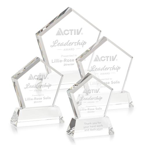 Illuminate the triumphs of exceptional performers with the Costa on Base Clear Polygon Crystal Trophy, a prestigious symbol of achievement and recognition. Crafted from premium optical crystal, this exquisite pentagon-shaped award glistens with sparkling facets, capturing light and attention from every angle. Designed to rest on one of eight sophisticated tapered bases, it offers a sturdy foundation and an air of elegance. While the image displays an example of personalization, please note that all trophies arrive blank, offering a canvas for your custom inscription to honor excellence. Optional second position etch and colorfill elevate the distinction of this brilliant accolade. Celebrate success and inspire continued brilliance with this timeless testament to outstanding achievement.