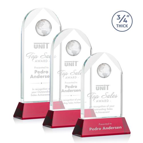 Honor remarkable achievements with the exquisite Cortez Globe on Helton - Red Award, a representation of elegance and success. This Starfire Crystal award boasts a gracefully beveled arch, crowned with an intricately detailed Optical Crystal Globe. It stands proudly on a sophisticated, tapered Optical Crystal base, available in an array of eight vibrant colors to complement your organization's branding or event theme. The red base option adds a dynamic splash of color that commands attention. Perfectly suited for corporate recognition, educational accomplishments, or any laudable milestone, this piece features optional second position etch and colorfill to further customize the accolade. Celebrate excellence with this dazzling testament to high achievement, where a blank canvas awaits your personalized message of commendation.
