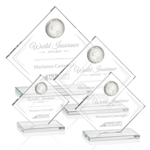 Honor global excellence with the Buckley Clear Globe Crystal Trophy, a symbol of world-class achievement and international endeavors. Expertly crafted from luminous crystal, this sophisticated award seamlessly blends a diamond-shaped Starfire Crystal with a meticulously detailed optical globe, showcasing beautifully frosted continents. The globe is poised atop the diamond, signifying the pinnacle of success and unity across the globe. Its pristine, blank surfaces await your personalized message, making it an ideal choice to commemorate outstanding contributions or celebrate expansive projects with a global impact. With its elegant design and meaningful imagery, this trophy will surely take pride of place in any recipient's collection or display.