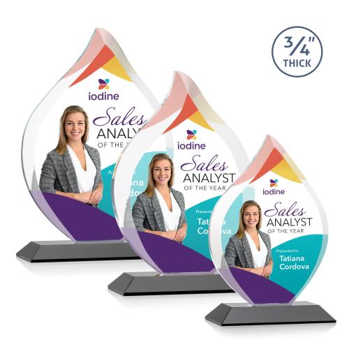Ignite the fire of recognition with the Cavazos Full Color Black Flame Crystal Trophy, a compelling symbol of passion and achievement. Crafted from the finest crystal with an elegant flame shape, this trophy captures the essence of success with its deep bevels and sleek mitered base. It stands as a vibrant testament to exceptional accomplishments, perfect for those who have blazed their own trail. Choose from an array of nine distinct base colors to personalize the backdrop for the dazzling full-color customization area, ensuring your award is as unique as the individual it honors. Each award comes thoughtfully packaged in a luxurious black satin-lined presentation gift box, making it ready to present and cherish. Whether you're celebrating a 'Sales Analyst of the Year' or any other outstanding achievement, this trophy is designed to be a thrilling and lasting tribute to excellence.