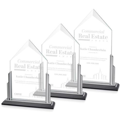 Celebrate triumphs and milestones with the distinguished Hogan Peaks Crystal Trophy, a symbol of prestige for any recipient. This exquisitely crafted award features a pristine optical crystal pentagon ascending to a majestic beveled peak, flanked by elegant silver pillars that add a touch of sophistication. Poised atop a robust ebony crystal base, this trophy is the perfect homage to exceptional achievement in any professional arena. Whether for real estate accolades or corporate honors, the Hogan Peaks Crystal Trophy is an impeccable choice that ensures recognition is both memorable and timeless.