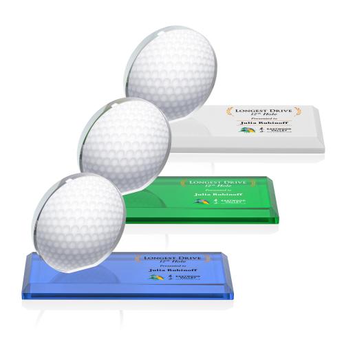 Celebrate each swing towards victory with the Hutchison Full Color Golf Circle Crystal Trophy, the quintessential accolade for golf enthusiasts and champions alike. This exquisite trophy features a stunning 3.5" Starfire Crystal disc, immaculately adorned with the lifelike image of a golf ball, capturing the spirit of the game in a symbol of pure elegance. Choose the foundation for your achievement from a selection of richly colored crystal bases or a classic rosewood Albion base, each enhancing the trophy's visual allure. The promise of second position golf ball imprint personalization awaits to honor the recipient's name and accomplishment, making it an unforgettable token of excellence. Crafted from the finest crystal and wood materials, this trophy's circular design embraces the allure of golf with timeless sophistication.