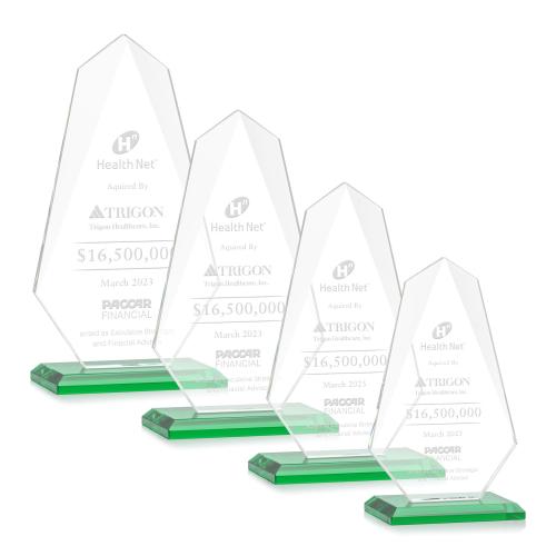 Discover the Byers Green Unique Crystal Trophy, a splendid accolade designed to illuminate achievements and express profound appreciation. Expertly crafted from premium crystal, this trophy boasts an innovative shape with beveled edges that cascade down elegantly, creating a captivating play of light. The trophy stands regally atop a choice of eight colored beveled bases, adding a personal touch to its already impressive stance. Each trophy begins as a pristine canvas, ready to be personalized for your special occasion. Ideal for any recognition or milestone, this award is nestled in a luxurious black satin-lined gift box, ensuring an unforgettable unboxing experience. Reward excellence and celebrate success in style with this magnificently designed masterpiece that promises to be a cherished keepsake.