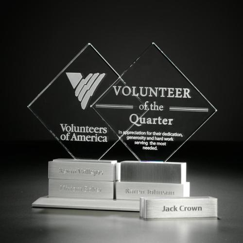 Celebrate achievements with the Diamond Tower Diamond w/4 Bars Crystal Trophy, a sophisticated blend of elegance and modernity, perfect for honoring exceptional accomplishments. Skillfully crafted from premium Starfire Crystal, this trophy features a striking diamond shape, embodying clarity and achievement, while the brushed aluminum base and four add-on bars offer a sleek contrast and customizable space to engrave milestones or recipient names. Designed for versatility, it's as stylish with or without the additional plaques, making it an ideal perpetual award for recognizing individual or team successes over time. Elevate your recognition program with this radiant symbol of excellence.