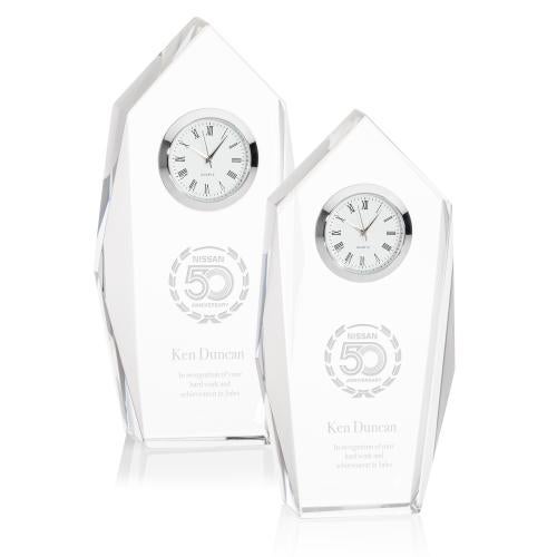 Experience timeless elegance with the Harden Clock, a sophisticated piece crafted from thick optical crystal. The design features distinctive side bevels, enhancing its peak-shaped silhouette, beautifully complemented by a classic white Roman numeral dial. This clock serves as both a functional timepiece and a stunning decorative element, making it an ideal choice for any desk or shelf. Its sharp, polygonal design adds a touch of modernity, perfect for office awards or personal gifts. Make it uniquely yours with custom personalization, turning this elegant crystal clock into a cherished keepsake.