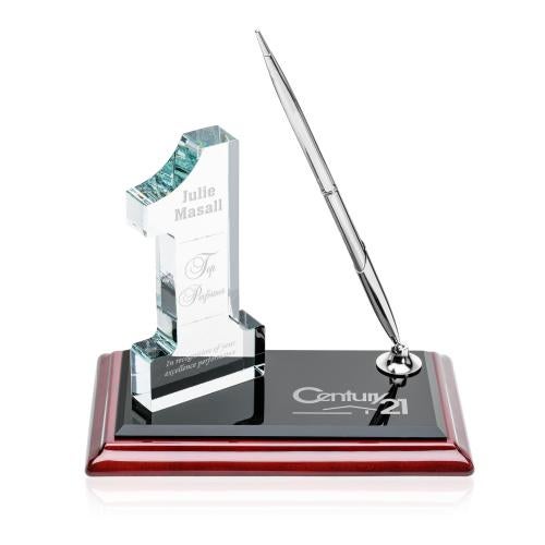 Elevate any desk space with the Albion™ Pen Set - Chrome, a symbol of achievement and functional elegance. This premium set features a stunning optical crystal "#1" mounted on a sleek wooden base with an integrated chrome pen. Its sophisticated design is complemented by the possibility of a second position etch and color fill, allowing for personalized customization to celebrate milestones or recognize excellence. Each set is crafted from the finest materials, including crystal, wood, and metal, ensuring durability and a timeless appeal. Perfect for corporate gifts, recognition awards, or a personal keepsake, this pen set promises to be a cherished item for its recipients.