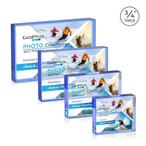 Introducing the Kimble Full Color Paperweight in a striking blue hue, an exquisite desk accessory that blends elegance and functionality. Crafted from premium Starfire crystal, this rectangular paperweight boasts impeccable clarity and clean lines, offering a modern touch to any workspace. Its robust 3/4" thickness ensures stability, making it more than just a decorative piece. With the flexibility to transform through full-color VividPrint customization, it becomes a personalized memento or a distinguished award. Whether you're recognizing achievements or adding a touch of class to your desk, this paperweight promises to impress while capturing life's vibrant moments.