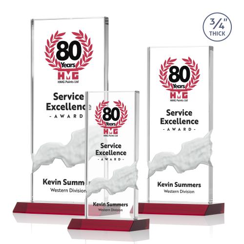 Presenting the Rubin Full Color Red Rectangle Crystal Trophy, an emblem of excellence and a distinguished choice for recognizing remarkable achievements. Expertly crafted from premium Starfire Crystal, this exquisite trophy boasts a compelling .75" thick vertical upright design with an intricately carved cascade waterfall feature, symbolizing the flow of success and perseverance. Resting on a polished, ruby red mitered base, it stands as a modern interpretation of traditional accolades. Its crystal-clear rectangular form elegantly frames personalized honors, making each award a bespoke testament to individual or team triumphs. Perfect for corporate recognitions, milestone commemorations, or any event where distinction is celebrated, this trophy embodies both the gravitas and the brilliance of outstanding performance.