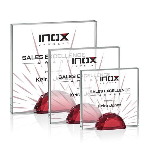 Celebrate exceptional achievements with the elegant Pruitt Full Color Red Square Crystal Trophy. This exquisite piece showcases a contemporary square, cube design crafted from luminous Crystal, creating a harmonious balance between modern sophistication and timeless appreciation. Two eye-catching red crystal diamonds anchor the Starfire Crystal, setting a dramatic backdrop that beautifully emphasizes your full-color personalized message. Whether honoring sales excellence, service milestones, or leadership success, this trophy will amplify your accolades with its brilliant clarity and vivid presence-making it a distinguished addition to any recipient's collection.