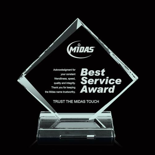 Celebrate outstanding achievements with the resplendent Sewell Jade Diamond Glass Trophy, a symbol of recognition that beautifully reflects the honor it represents. Crafted from premium jade glass, this trophy stands 6" tall and draws the eye with its distinctive diamond shape and elegant beveled edges that catch and scatter light in a dance of luminosity. The spacious central etching area awaits your personalized message, ensuring each award is as unique as the accomplishment it celebrates. Available in larger sizes of 7.5" and 9" for varying levels of distinction, this award's prestigious design is poised to become a treasured keepsake. Whether for corporate recognition, personal milestones, or team accolades, this trophy is a timeless testament to excellence.